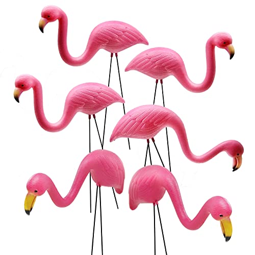 Set of 6 Small Pink Flamingos in 2 different designs. Each flamingo measures 8 to 10 inches long and stand around 14 to 15 inches tall. made of sturdy plastic and strong paint that won’t fade easily. Thick galvanized steel legs are anti-rust strong to take on any soil ground. These vivid pink flamingos are made to keep your garden decoration look good year round.