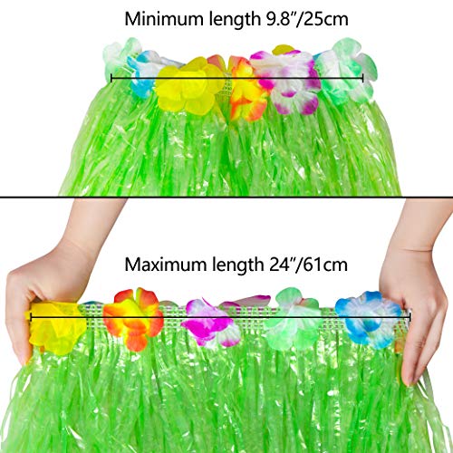 Package includes 12pcs grass skirts and 12pcs wristbands. Each hula skirt features a row of colorful silk faux flowers.