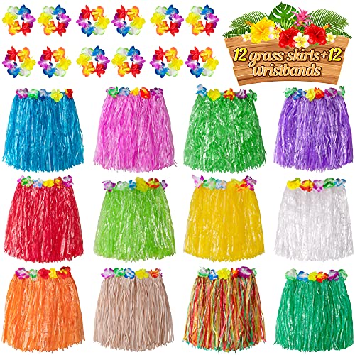 jollylife 12PCS Hawaiian Luau Hula Skirts + 12PCS Wristbands – Hibiscus Flowers Birthday Tropical Party Decorations Favors Supplies