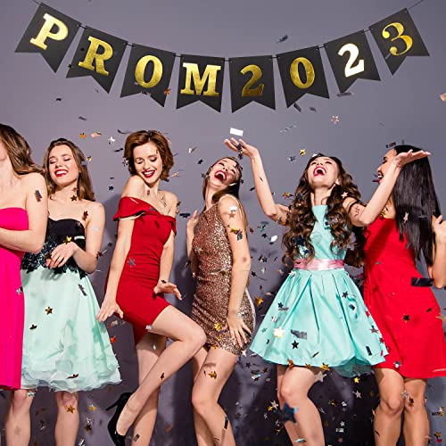 To celebration 2023 graduation: the prom 2023 banner feature black color background and gold letters [Prom 2023], glitter shine under the light, nice to celebrate the graduation of class 2023, good to express your excitement to graduate and expectations for a bright future